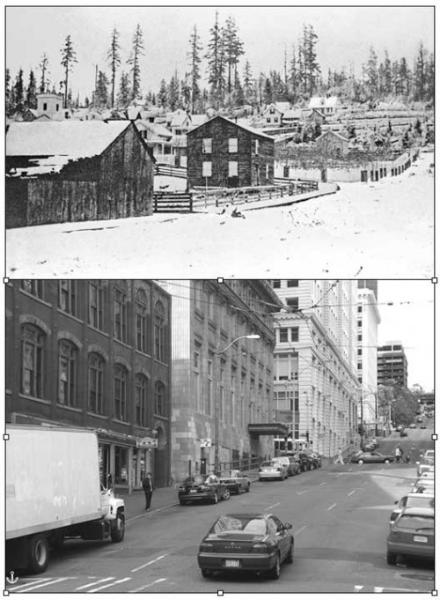 | Earliest photo of Cherry St., Seattle from 1875, and what it looks like today. http://pauldorpat.com/wp-content/uploads/2009/01/x4-1875-blog-cherry-street-snow-grab.jpg |