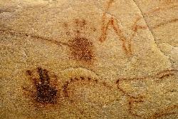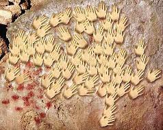 Positive hand prints, formed by coating the hand with pigment and pressing the hand on the wall. The second hand print may have been done at the same time, without recoating of the hand, as it is fainter.