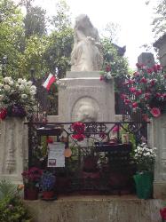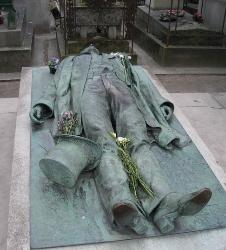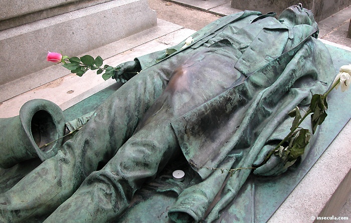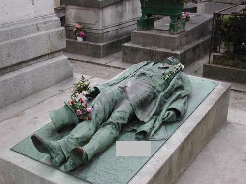 It is fairly easy to read the words �tue janvier� (French for killed in January) on the tomb. At first I thought the year indicated 1670 instead of 1870 which resulted in some fruitless searches. A search for 'French tomb flowers in top hat', led me to information about the Pere-Lachaise Cemetery in Paris, France. I discovered the tomb is for a former French journalist, whose pen name was Victor Noir (born Yvan Salman). If I had searched for 'French tomb killed in January 1870' the Wikipedia article about Victor Noir would have surfaced immediately. Noir was shot by the great nephew of Emperor, Napoleon Bonapart. Some articles refer to a duel between Noir and Prince Pierre Bonapart.
