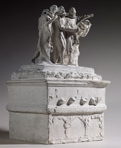 The notion of collective sacrifice was emphasized even in the first maquette.The six figures, not yet individualized, were presented on the same plane, one next to the other, with no visible order of importance and all clad in the loose garments of men about to be executed. They were placed on a very high rectangular base, adorned with bas-reliefs, which formed a triumphal pedestal. This first maquette was greeted enthusiastically by the committee. Rodin was officially awarded the commission for the