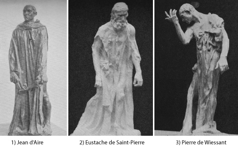 1. Auguste Rodin. 2. The six burghers of Calais surrendering to King Edward III of England in return for sparing the city in 1347. 3. In front of the Calais Town Square.
