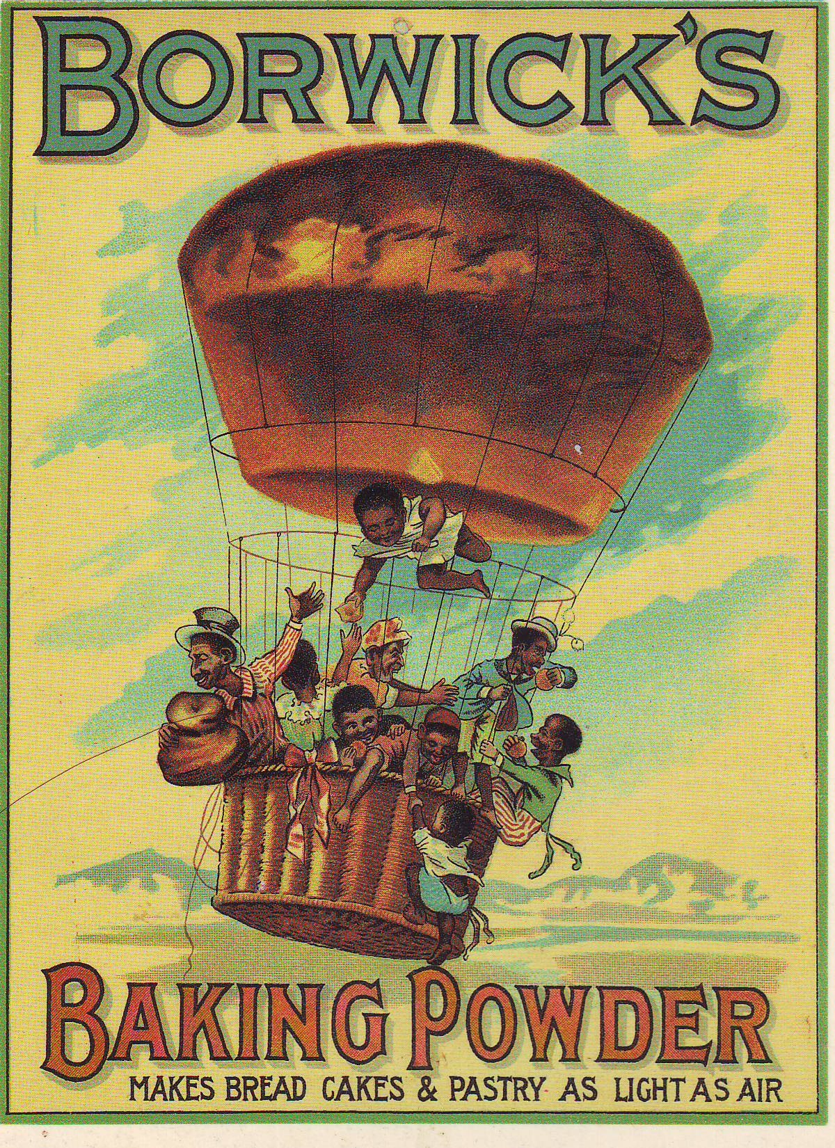 How much baking powder was sold in 19th century England? Borwick’s sales campains seem to have worked - for decades later when this was reproduced as a postcard it had the name as ”Borthwick”, so advertising seems to have been sensible. But why the black family as passengers in the bread-balloon?