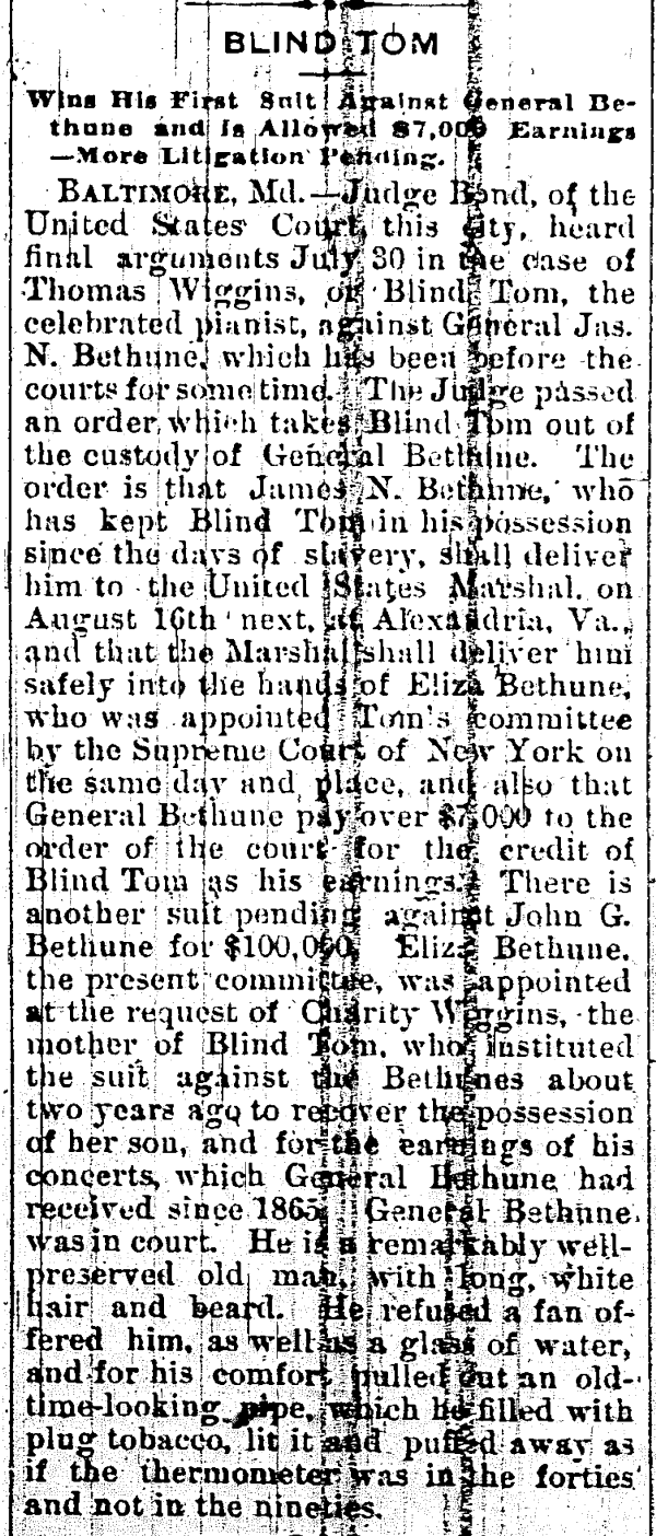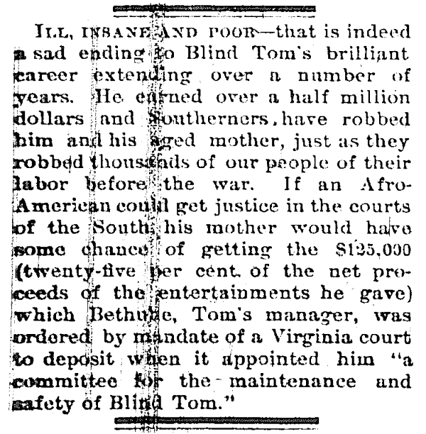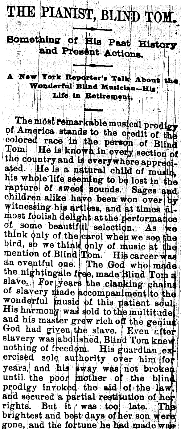 York Times headline read "BLIND TOM, PIANIST,
