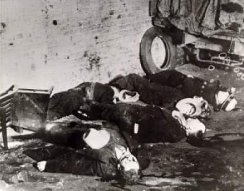 | The grisly scene inside the SMC Cartage Company after gunmen dressed as policemen mowed down members of the Moran gang. (Chicago Tribune / February 14, 1929) http://www.chicagotribune.com... |
