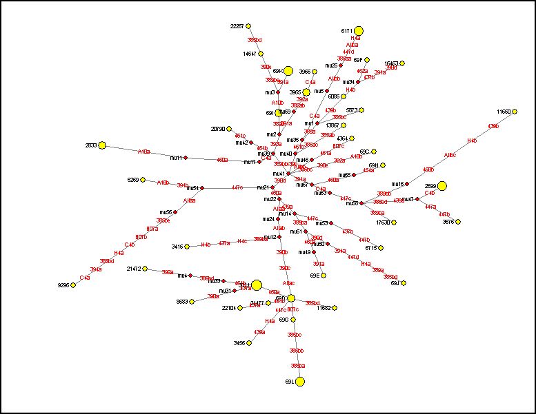 Yellow circles represent the DNA profiles or haplotypes of one or more participants. Red circles represent individuals whose DNA profile is not yet included in the study. Red labels represent markers where a mismatch exists between haplotypes.