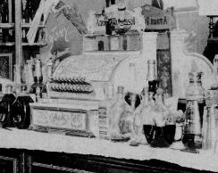 This cash register has two rows of keys, thirteen on the top and fourteen on the bottom. According to the National Cash Register Catalog for 1909 (http://www.brassregisters.com/ncr/cat/1909cat300class.htm), the key pattern corresponds to that of Models 346, 347, and 349. The catalog states that the Model 349 was made especially for bars and cafes, with a security feature to prevent an employee from stealing from the till. For this reason, the register in the picture was probably a Model 349, which sold for $125 in 1909. According to http://members.aol.com/ErgoFred/ncr/info/5ts.htm, the case is the dolphin design with an additional dolphin style marquee across the top reading "Amount Purchased" that was in use from 1902 through 1915. Since the Model 349 register probably appeared in the NCR catalog for several years around 1909, and it was likely used in the bar for a period of time, 1909 is only an approximate year for the picture. But this is a good starting point for further research.