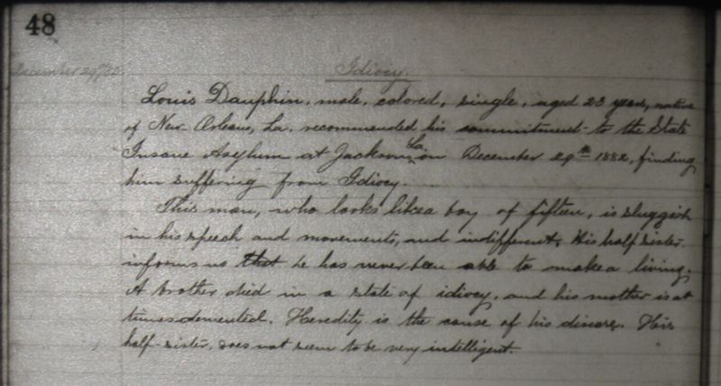 his commitment to the State Insane Asylum at Jackson, La. on December 29th, 1882, finding him