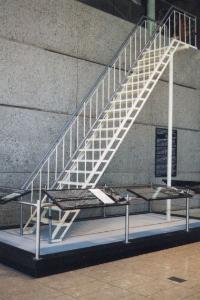 Right: Staircase in the Gerald Ford Museum in Grand Rapids, MI. Top left: Van Es photograph showing the staircase used during the evacuation from the roof of the Pittman Apartments. Bottom left: Staircase on the roof of the U.S. Embassy in Saigon before the Embassy was torn down in 1998 and the staircase was moved to the Ford Museum.