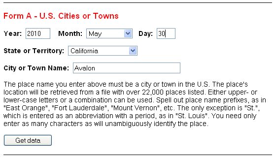 The following information is provided for Avalon, Los Angeles County, California (longitude W118.3, latitude N33.3):