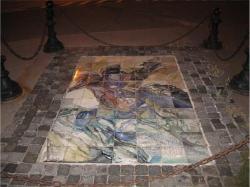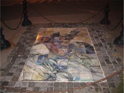1. What do these shoes commemorate? 2. What is the name of the business across the street to the left of this walkway? 3. Name one other tourist attraction in this city.
