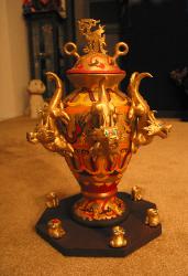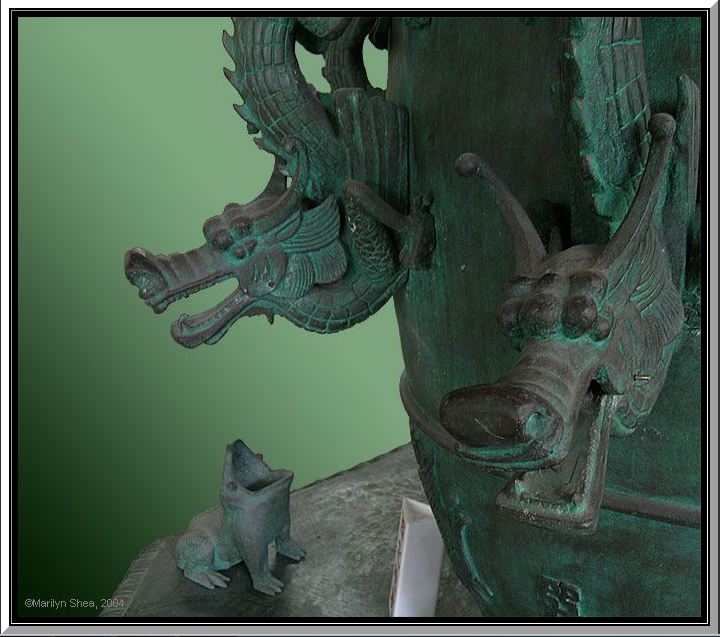 I knew right away it was Chinese because of the curly noses design of the dragons, but then I wondered what it actually did. My first guess it was something to do with tea, like a samovar. You put the tea in, the clapper thing stirred it around and then when it was ready the balls dropped into the frog and the tea could be poured out of the dragon's mouth. Then I thought, well probably not, as they have those other teapots that they use.
